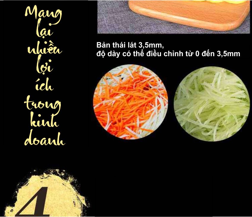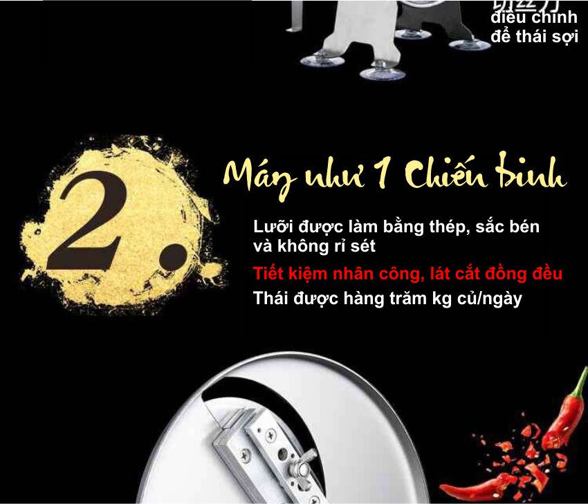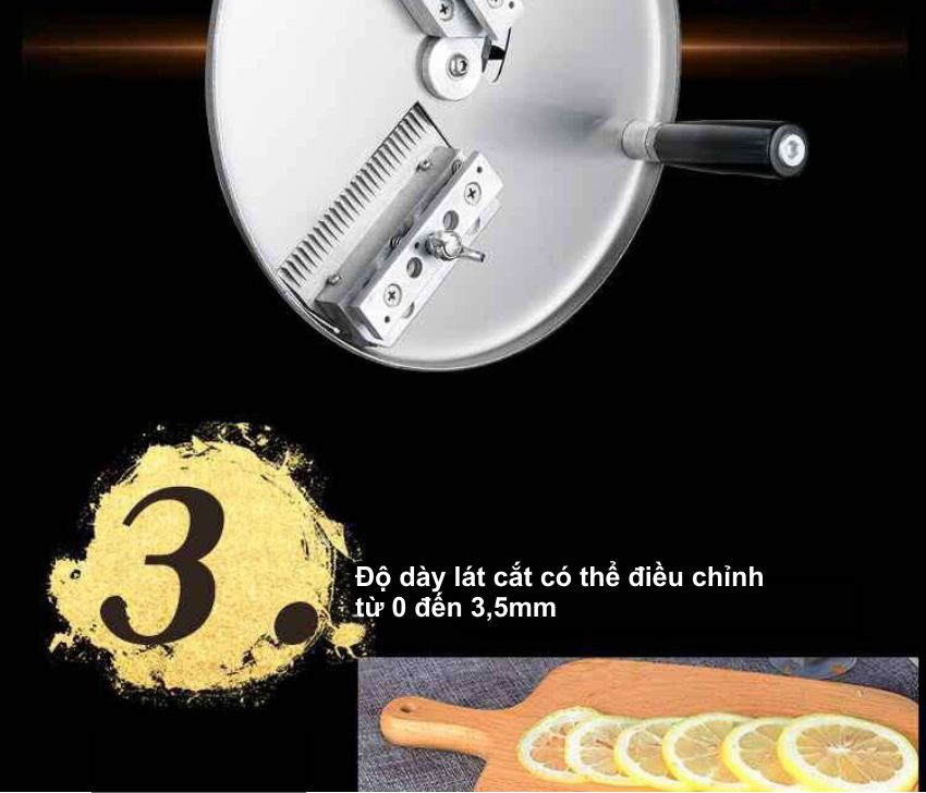 - Thái lát đều, độ dày có thể chỉnh tùy ý.
